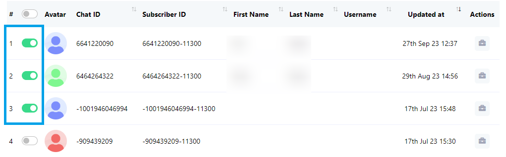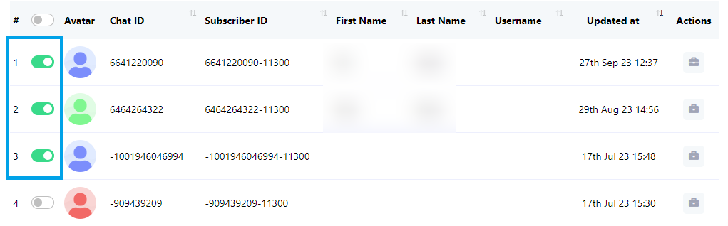 - In the list of subscribers, toggle the subscribers you wish to delete. You can toggle a single subscriber or multiple subscribers according to your preferences.