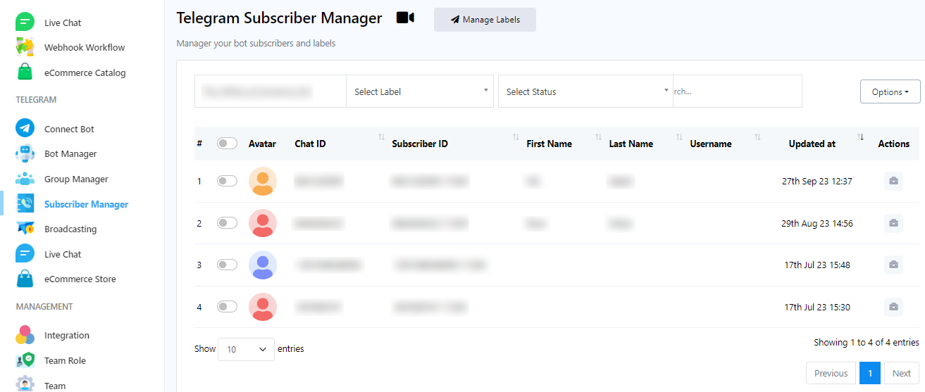 - Begin by accessing the `Manage Label` field within the Telegram Subscriber Manager Menu.