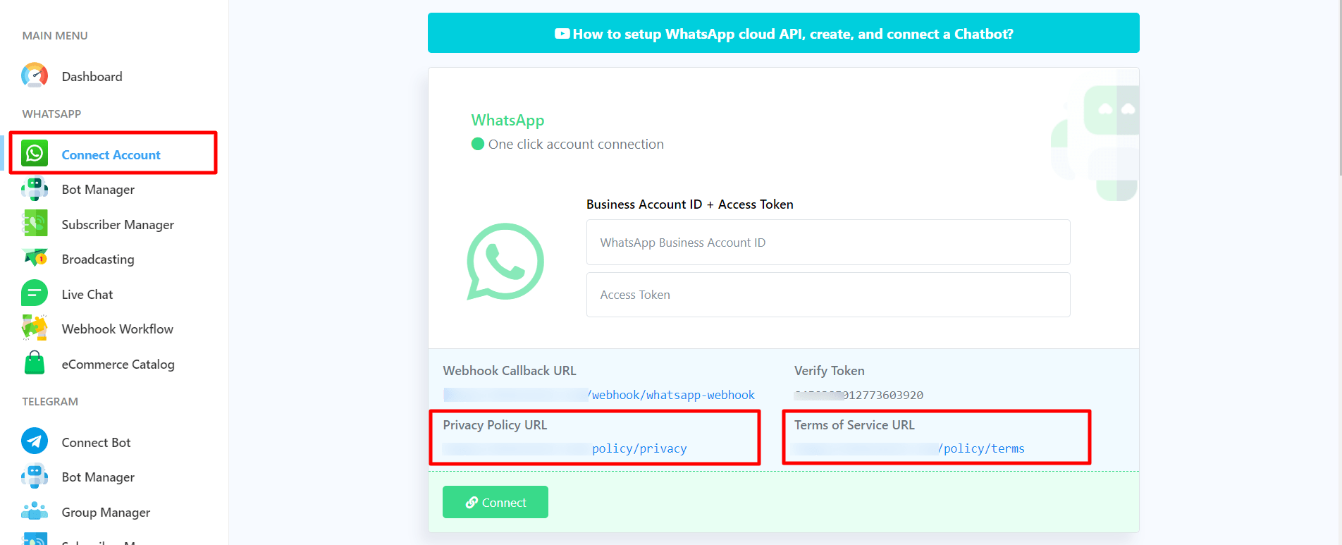 To get the callback URL and verify the token from BOTFORCE. Login to your account and go to the dashboard of BOTFORCE. At the left sidebar of the Dashboard, under the WhatsApp section, you will see connect WhatsApp option. Now click on the connect WhatsApp menu and instantly, Connect WhatsApp Business page will appear.